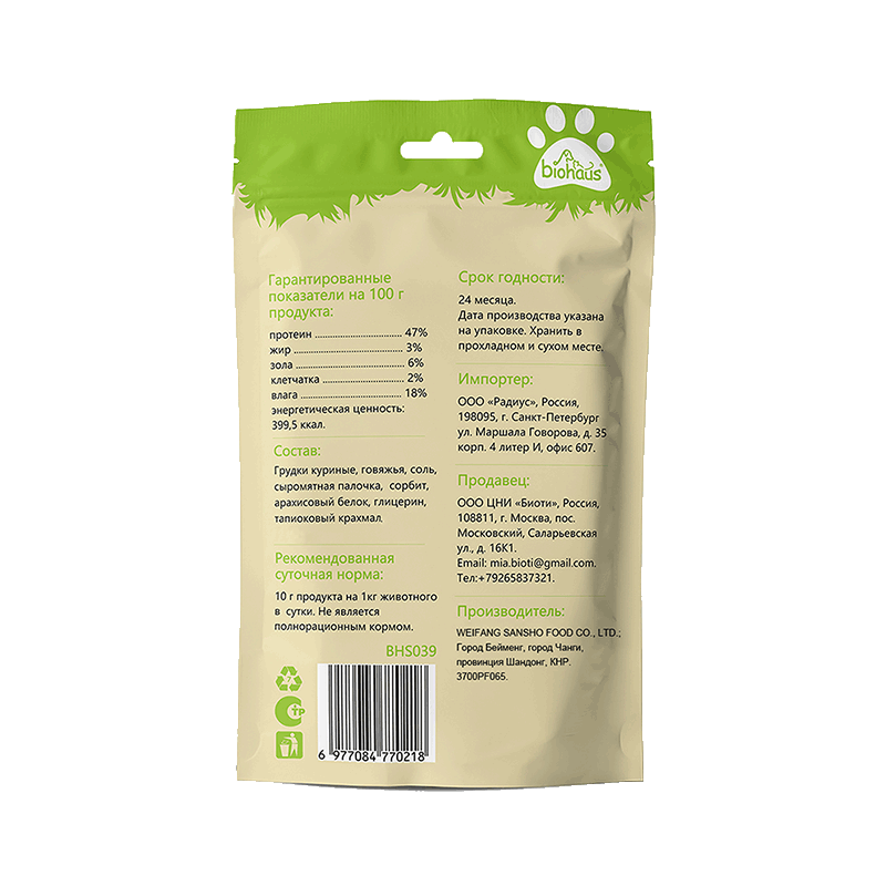 Состав: грудки куриные, говяжья сыромятная палочка, арахисовый белок, сорбит, глицерин, соль, тапиоковый крахмал.