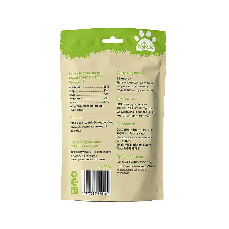 Состав: утка, арахисовый белок, сорбит, соль, глицерин, тапиоковый крахмал.