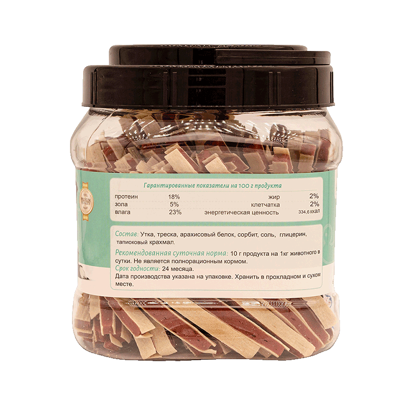 Состав: утка, треска, арахисовый белок, сорбит, соль, глицерин, тапиоковый крахмал.