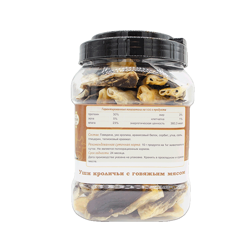 Лакомство «Говядина в кроличьих ушках»: двойная сила для вашего питомца! Хрустящие кроличьи ушки, богатые натуральным хондроитином, объединены с нежнейшей говядиной премиум-класса! здоровье опорно-двигательного аппарата + мышечный тонус в одном угощении!