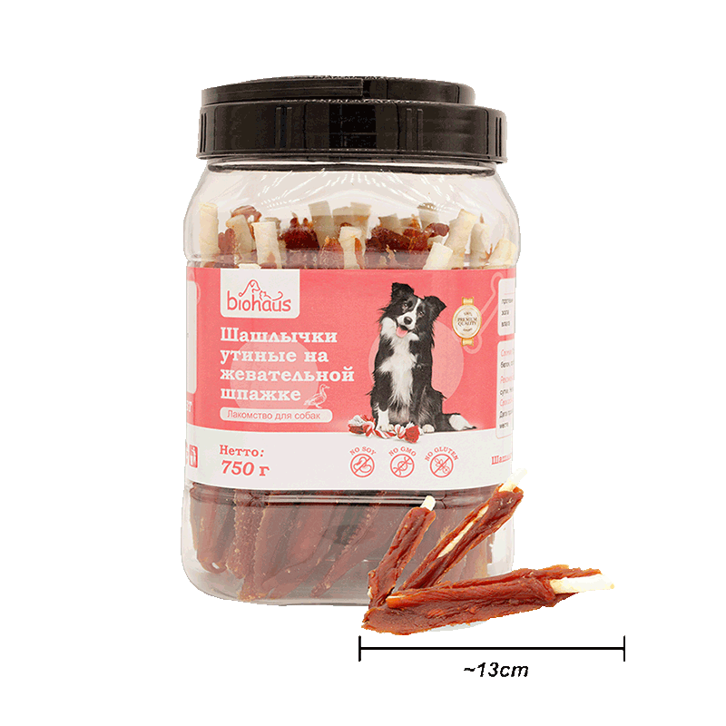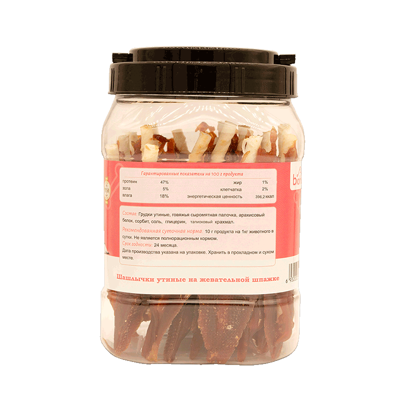 Состав: грудки утиные, говяжья сыромятная палочка, арахисовый белок, сорбит, соль, глицерин, тапиоковый крахмал.